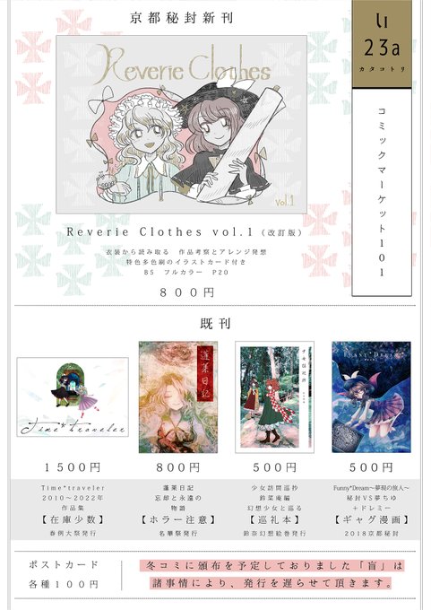 【Sample】 C101 2日目(土)い-23a カタコトリ 頒布予定のイラストカードのサンプルです 宇宙×秘封倶楽部×不思議の国のアリスがテーマとなっております。🌠🐰🐑🕰 当日どうぞ宜しくお願い致します⭐️ #C101告知 #C101東方告知 【お品書き】 twitter.com/suwa_moriya/st…