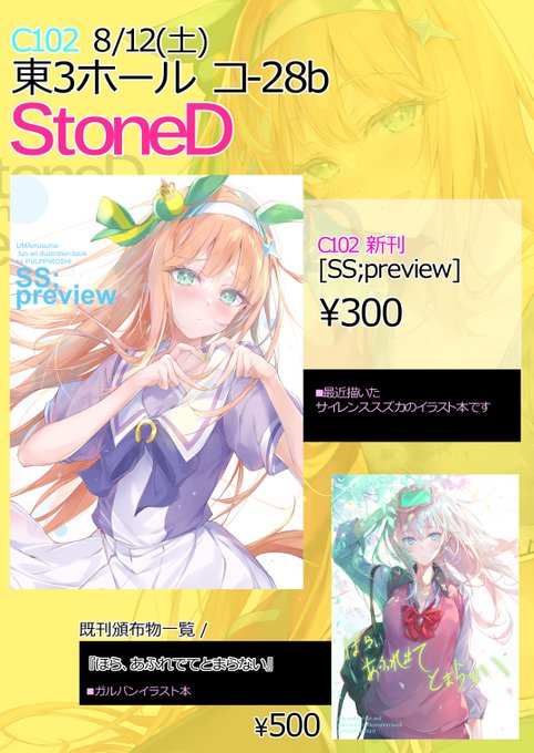 🐶【C102 夏コミお品書き】🍀 スペース:1日目 ・東3ホール コ-28b [stoneD] とっっっても薄いですが...新刊あります ウマ初参加のサイレンススズカイラスト本になります 当日はどうぞよろしくお願いいたします🐾 #C102 #C102おしながき #ウマ娘
