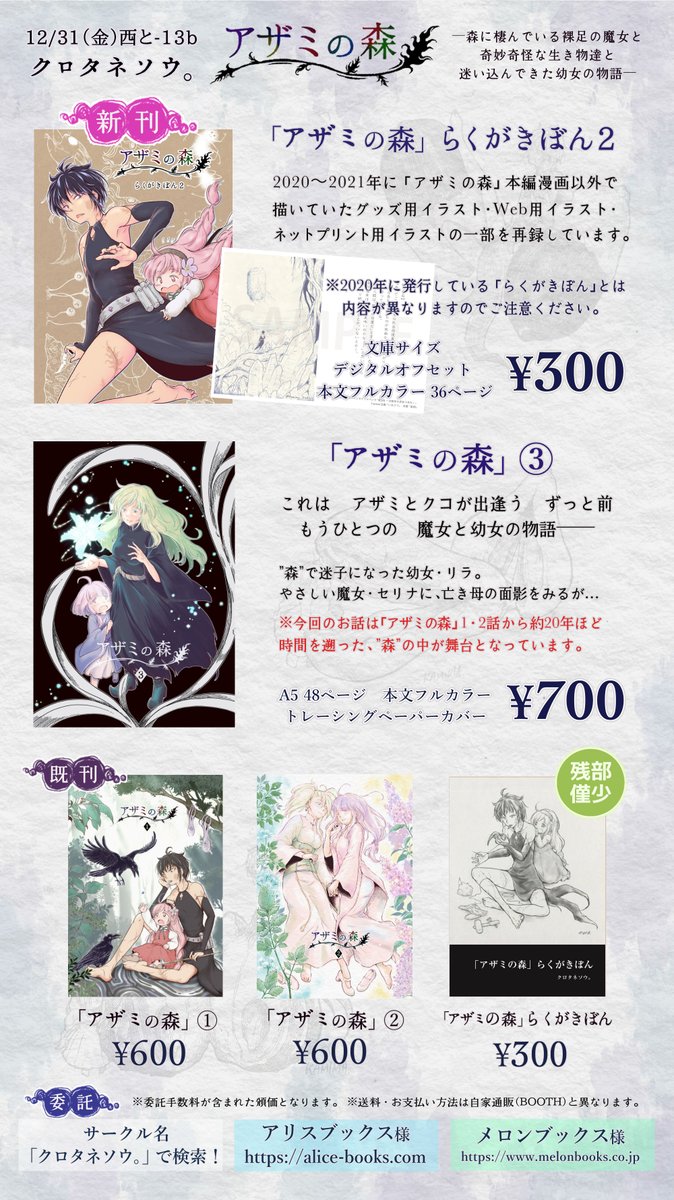 12/31(金)西1 と-13b「クロタネソウ。」 一次創作で初めてのコミケ参加です! 森に棲んでいる裸足の魔女と、奇妙な生き物達と、迷い込んできた幼女の物語「アザミの森」同人誌・グッズ各種🌳 キャッシュレス決済対応します✨ webcatalog-free.circle.ms/Circle/15719934 #C99WebCatalog #C99 #C99A #一次創作 #お品書き