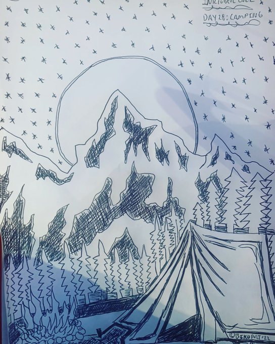 Inktober 2022: Day 28-Camping #inktober #inktober2022 #inktober20 #inktoberday22camping #day22camping #camping #tent #forest #pinetrees #stars #mountains #moon #campfire #camp #blackpen #inkdrawingofcamping #mature #campinginthewoods #campinginnature #bikoart @inktober