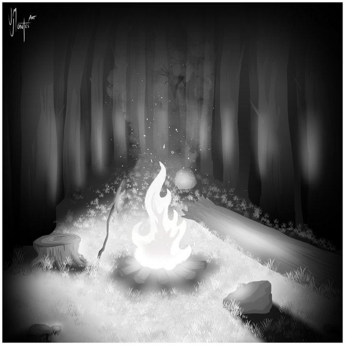 Inktober 2022 jour 28: "Camping" #inktober #inktoberday28 #inktober2022 #artoftheday #30minutesart #clipstudiopaint #digitalart #camping #darksouls #fire #feudecamp #campfire #blackandwhite