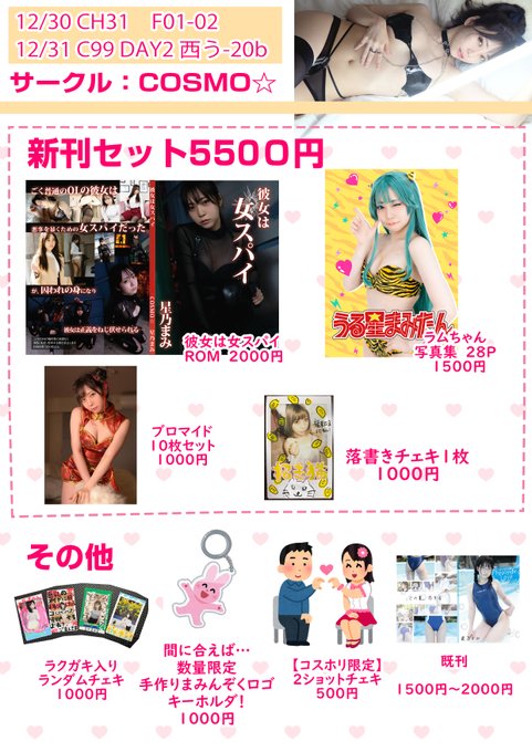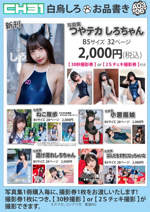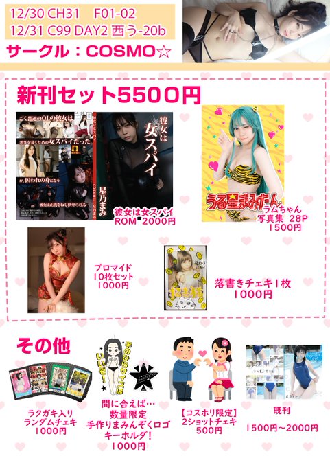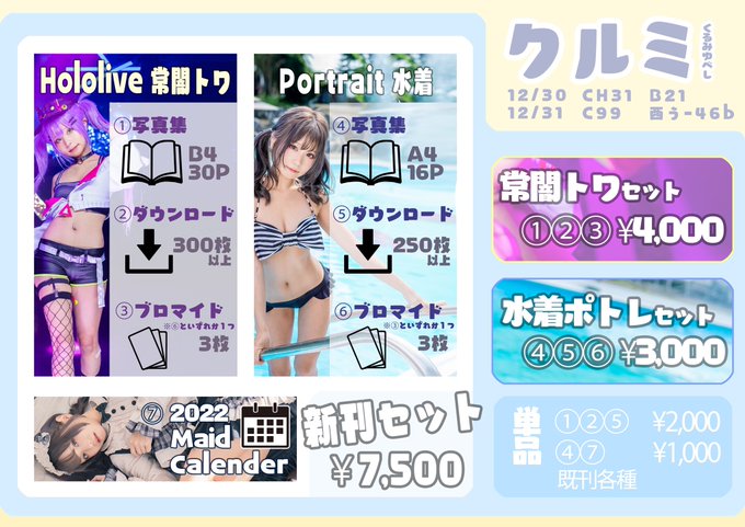 📢コミケ・コスホリ お品書き📢 ー新刊ー ○hololive常闇トワ 写真集👾 ○夏水着ポトレ写真集👙 カレンダー等グッズも作りました! 12/30 CH31 B21 …セットは撮影券つき 12/31 C99 西う-46b …会場限定セット特典あり よろしくお願いいたします✨ #C99 #CH31 通販⤵︎ ︎ kurumipurarine.booth.pm/items/3529275
