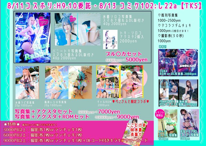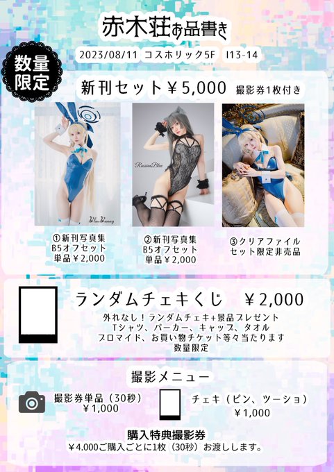 🖤コスホリックお品書き🖤 夏の新刊セットとランダムチェキくじを作りました! この他に既刊等もありますっ 会場でお会い出来るのを楽しみにしております♡ コスホリック36(#CH36) 日時:2023年8月11日(金・祝) 時間:13:00~18:00 場所:東京都立産業貿易センター 台東館5階 #コスホリック… twitter.com/i/web/status/1…