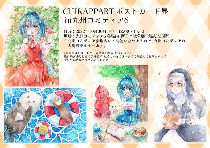 10/30開催の #CHIKAPPART ポストカード展in #九州コミティア6 に展示参加しております!展示・販売イラストは画像内にある4枚です 秋らしい1枚から夏の思い出感満載の動物絵まで描きましたので、よろしくお願いしますー! 恐らく年内の展示参加はこれが最後になるかと思います