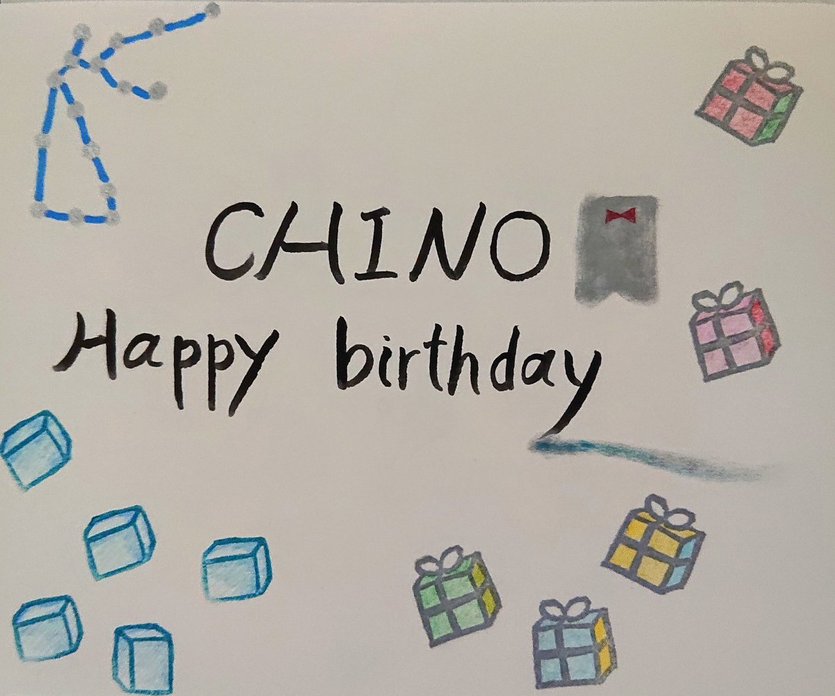 チノ先生、お誕生日おめでとうございます! 消しゴムはんこ、筆ペン、色鉛筆などを使ってチノ先生に関するものを表現しました! これからも、応援しています!! #CHINOバースデー #VALIS_ART