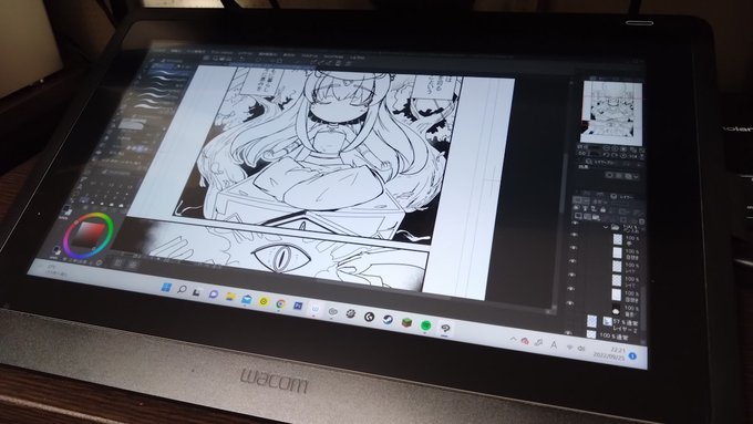 【同人誌作業風景】次回発行予定のオリジナル同人誌について、下書き&ペン入れ中(全26P)…。メインのデスクトップPCとwacomのCintiq 16 で描いています。新刊は来年春のイベントで出したいなあ。#漫画好きと繋がりたい #猫耳 #漫画 #絵描きさんと繋がりたい #Cintiq