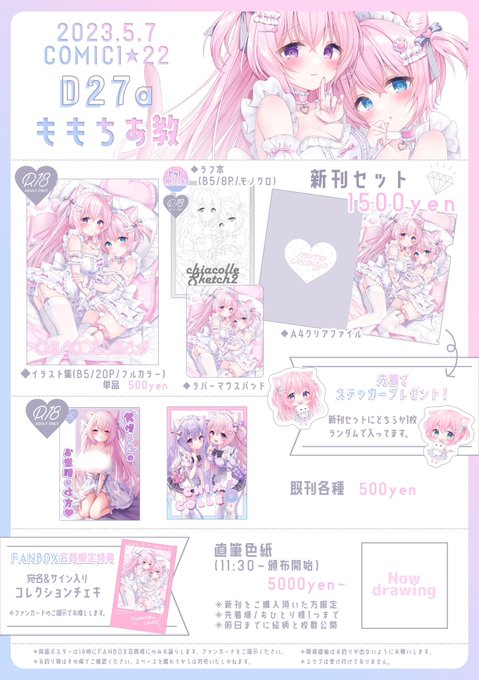 🎀 コミ1 お品書き 🎀 *⋆꒰ঌ┈┈┈┈┈┈┈┈໒꒱⋆* 5月7日(日) COMIC1★22 【 ももちあ教 D - 27a 】 ◇先着プレゼント ⋮ ステッカー、コラボ缶バッジ ◇ポスターはFANBOX会員様にお譲りします! よろしくお願いします🫧 #COMIC1 twitter.com/i/web/status/1…