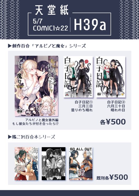 5/7 COMIC1☆22「天堂紙」のお品書きです 【H39a】にてお待ちしております! 創作百合と艦これの既刊持っていきます どうぞよろしくお願いします! #COMIC1 ▼創作百合本サンプル▼ pixiv.net/artworks/99974…