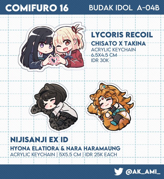Hello! 🌻 Here's my catalogue for Comifuro 16! There are Lycoris Recoil, Revue Starlight, and Nijisanji ex-ID merch! Come visit booth Budak Idol A-04b! I'll be attending both days (6-7 May)! See you there~ 😊 #comifuro16 #comifuro #cf16