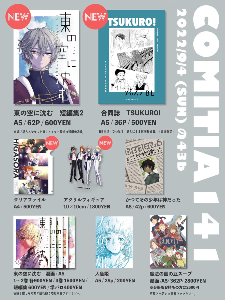 9月4日(日)東京ビッグサイトにて開催される #COMITIA141 のお品書きです!の43b おこめのかし にてお待ちしております! 『東の空に沈む 短編集2』と友人2人との合同誌(会場限定)の2冊とアイドルパログッズ2種が新作です! リプにサンプルなど繋げます! #COMITIA141お品書き #コミティア141