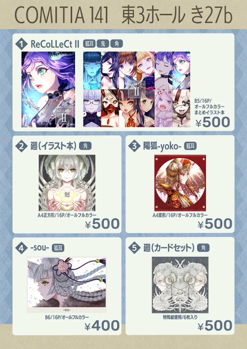 9/4(日)開催のコミティア141のお品書きになります!今回は既刊のみとなりますが、グッズ等も持っていきますのでよろしくお願いいたします! 【ヒトヒラ/東3ホール き27】でお待ちしております! #COMITIA141 #コミティア141 #イラスト #狐耳 #鬼 #角 #COMITIA141お品書き #お品書き