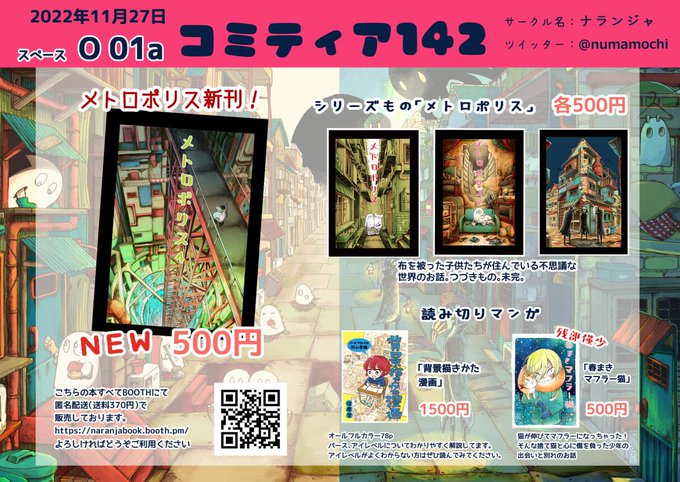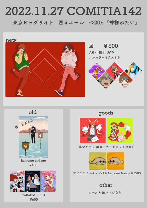 11月27日(日)に東京ビッグサイトで開催される #コミティア142 に参加します! のらさんと合同で、グッズのお会計は全て一緒になります。どちらかが離席していてもお買い物は可能です🛍️ #コミティア #COMITIA142お品書き