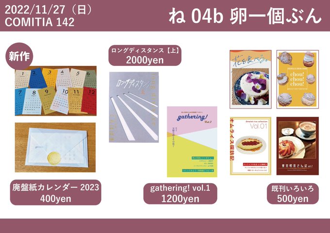 明日のCOMITIA142でも廃盤紙カレンダー2023を引き続き頒布します! もう生産されていない紙で作った名刺サイズのカレンダーです、紙好きの方はぜひ! ね04b「卵一個ぶん」でお待ちしております! #COMITIA #COMITIA142 #COMITIA142お品書き