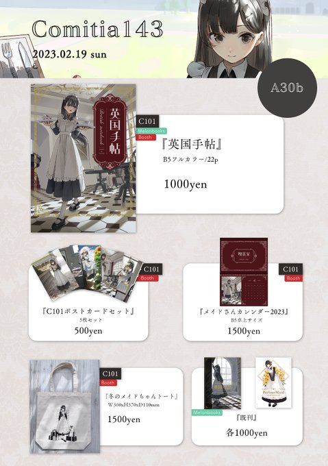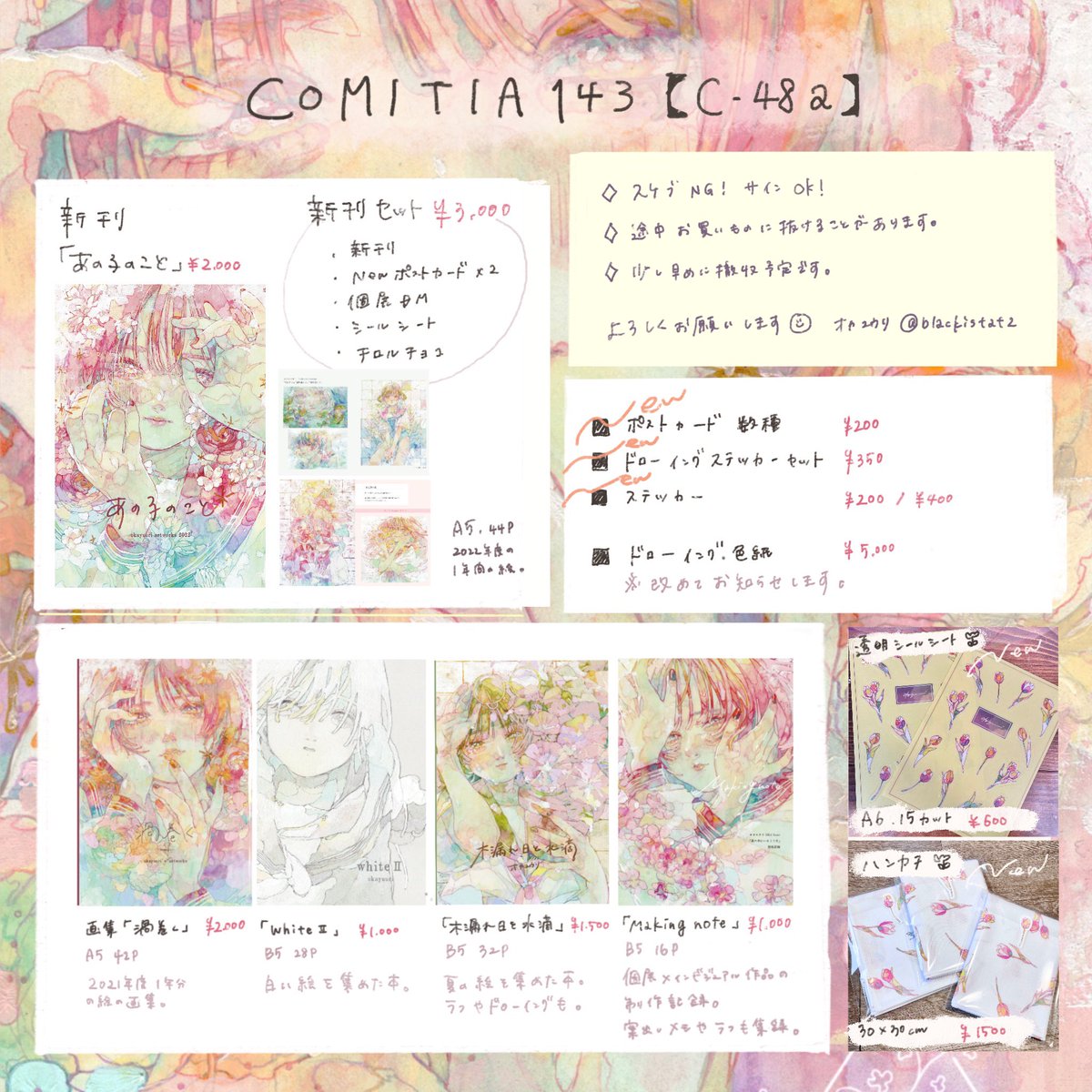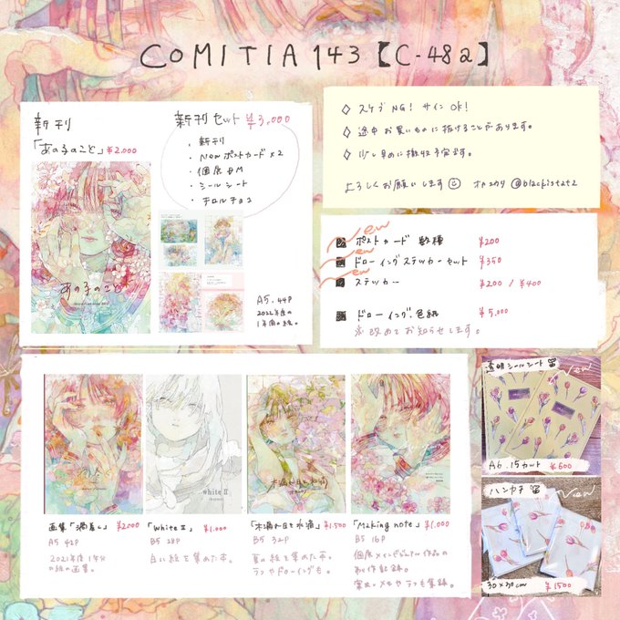 #COMITIA143 #COMITIA143お品書き お品書きです! ポストカードとオンデマンド箔スクエアカードに新作があります☺︎ トンボ鉛筆さんにスペースにてABTの実演してる時間帯もございますので、そちらも是非見にきてください💃