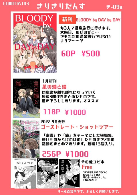 COMITIA143のお品書きです。 オール百合本予定です(リプライにサンプル置きます) 「き-09a きりきりだんす」よろしくお願いします! ウオーッ❗️🐟#COMITIA143 #COMITIA143お品書き
