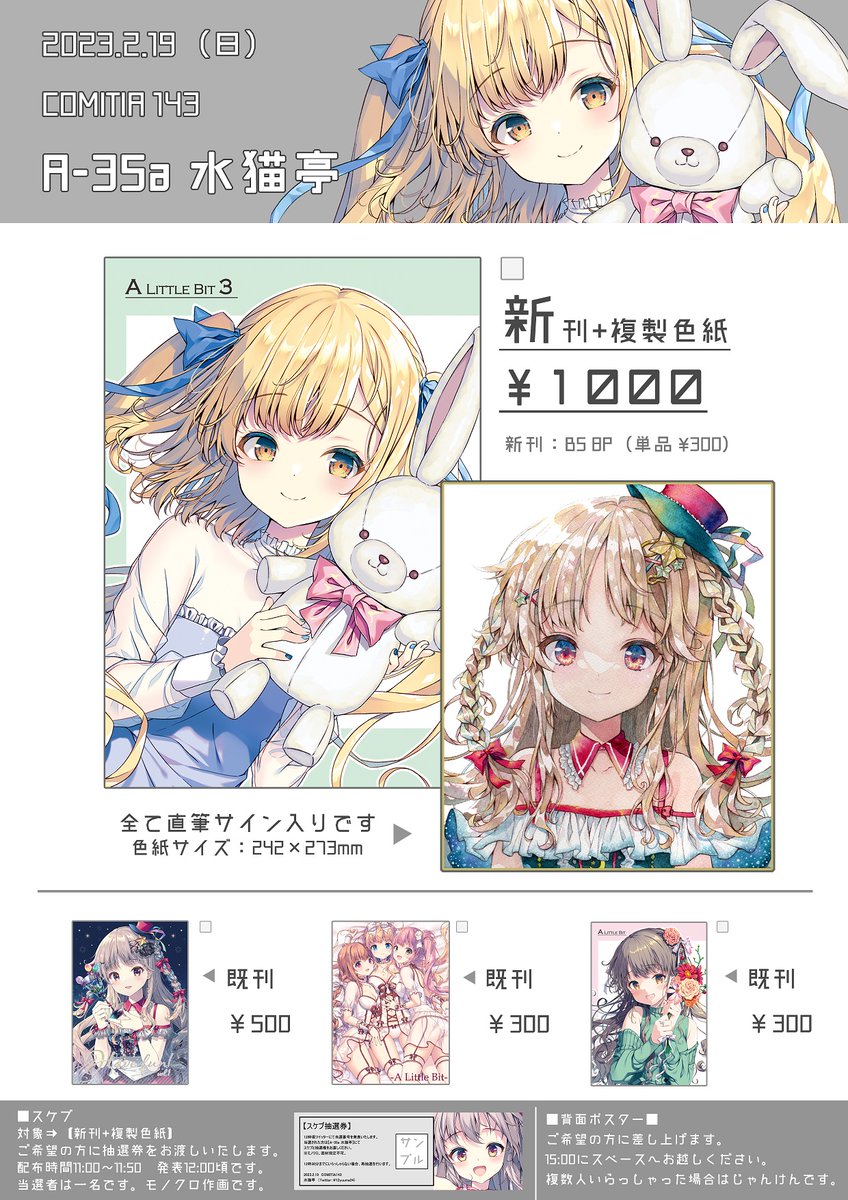 ⭐️2/19 コミティア143のお品書きです⭐️ スケブは抽選で、11:00~11:50に抽選券配布します。 【A-35a 水猫亭】にてお待ちしてますー! #COMITIA143 #COMITIA143お品書き #コミティア143