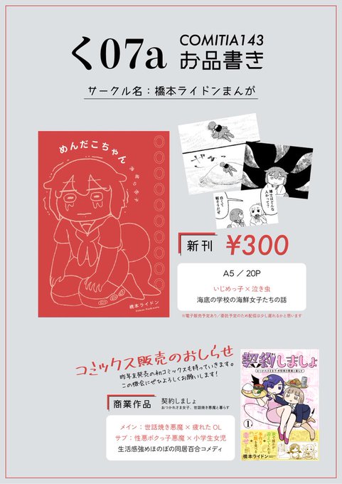 【一族郎党】2/19(日)開催の #コミティア143 のお品書きです。めんだこちゃんの漫画を描きました。「契約しましょ」コミックスも持っていきます。く07a/橋本ライドンまんがでお待ちしております〜! #COMITIA143 #COMITIA143お品書き