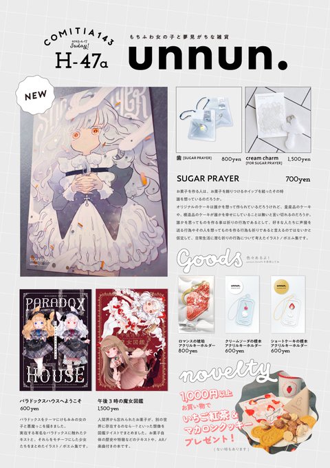 ギリギリになっての告知になんですけど、明日のCOMITIAにスペース出ています。 お品書きのいずれかの本を購入すると無配が2種付きます(数には限りがございます) 通販こちら→ ecs.toranoana.jp/tora/ec/cot/ci… #COMITIA #COMITIA143 #COMITIA143お品書き #擬人化創作 #ワンモタ #西遊記 #ユウラマイシン
