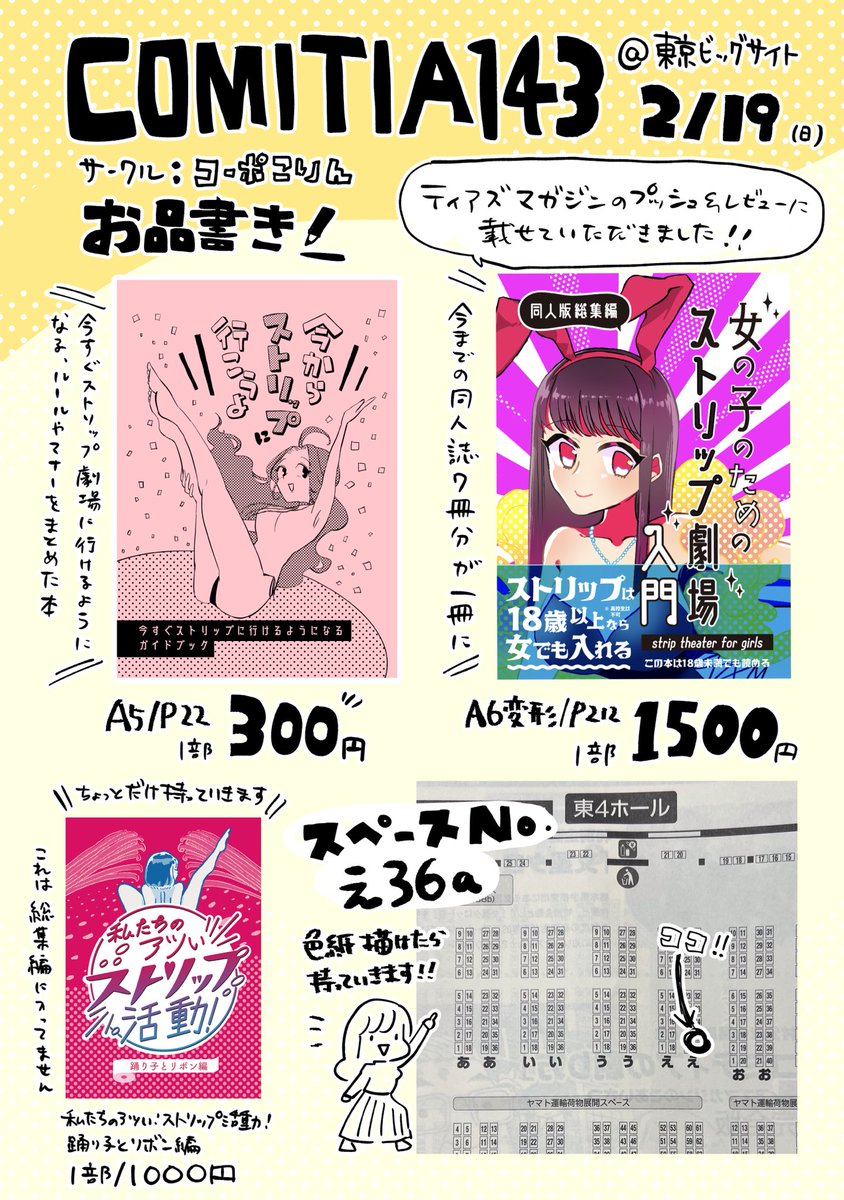 【コミティアお品書き】 ストリップ劇場のレポ漫画のサークルです! 「ストリップ気になってるんだけど最初の一歩が…」という方向けのガイドブック本あります✨ 今回は新刊は無いのでまったりスペースだと思います。質問などもお気軽に! #COMITIA143お品書き