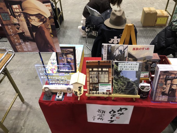 ヤナウェーブ研究所、設営完了! 今回は提灯をぶらさげています! くすのきや@kusunokiya さんで作っていただきました! 温泉宿っぽい雰囲気が出て最高です♨️ コミティア143、J08bでお待ちしています! #COMITIA143 #コミティア143 #ヤナウェーブ研究所同人部 #ヤナウェーブ研究所温泉部