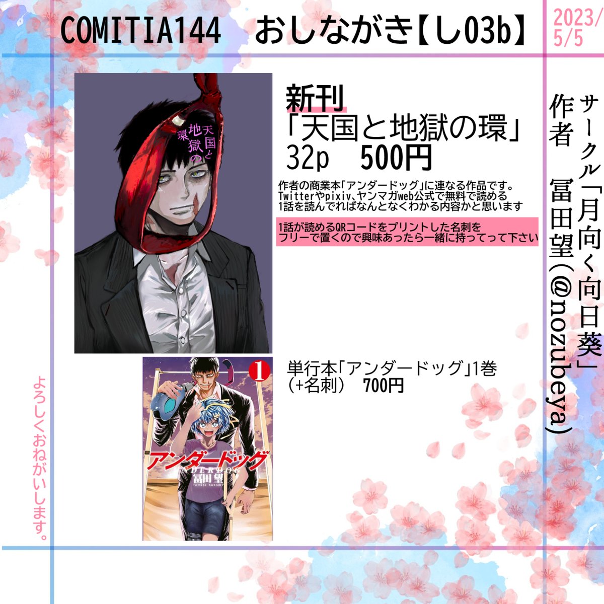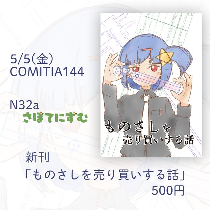 COMITIA144 2023/05/05(fri) 東京ビックサイト東456ホール スペース「A-59b」紡想 再度告知!当日はよろしくお願いします! 開場から1時間は買い物に行っておりますので、ゆっくりペースで遊びに来てください。 #COMITIA144 #COMITIA144お品書き