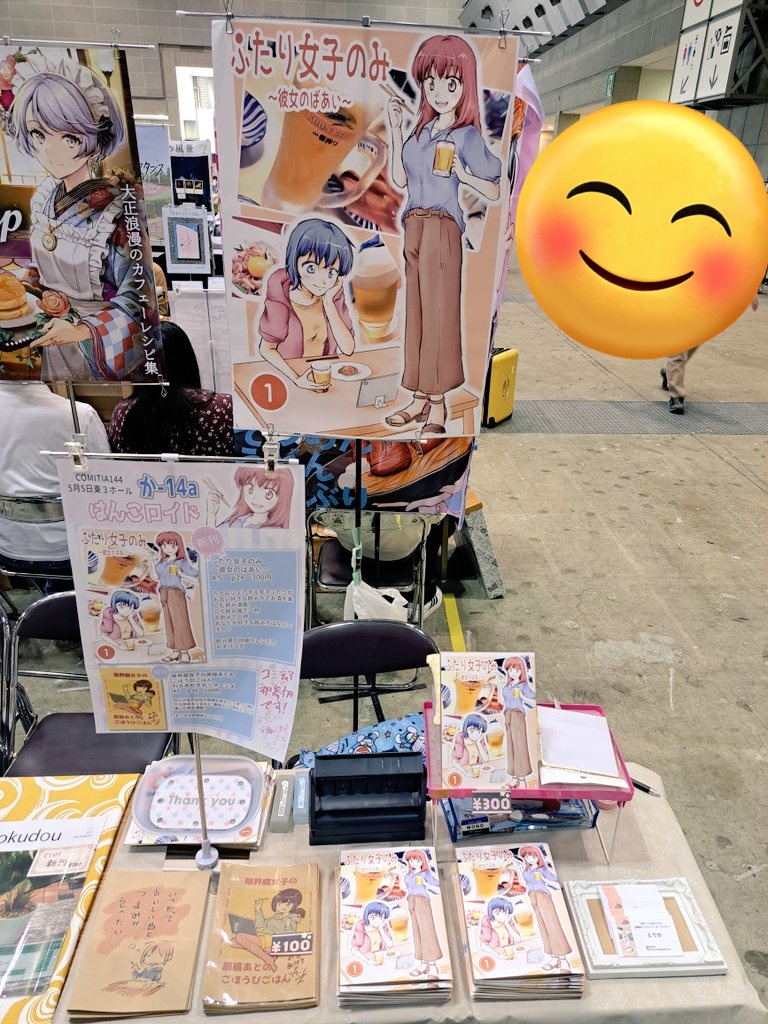 COMITIA144 はんこロイド 設営完了しました!!ふぁぁ〜!めちゃくちゃ緊張で泣きそう😭よろしくお願い致します!!! 名刺も持ってきました。よければ貰ってください。あと需要あるかわからないけれど、これから色紙描きます🥳 #COMITIA144 #COMITIA144お品書き
