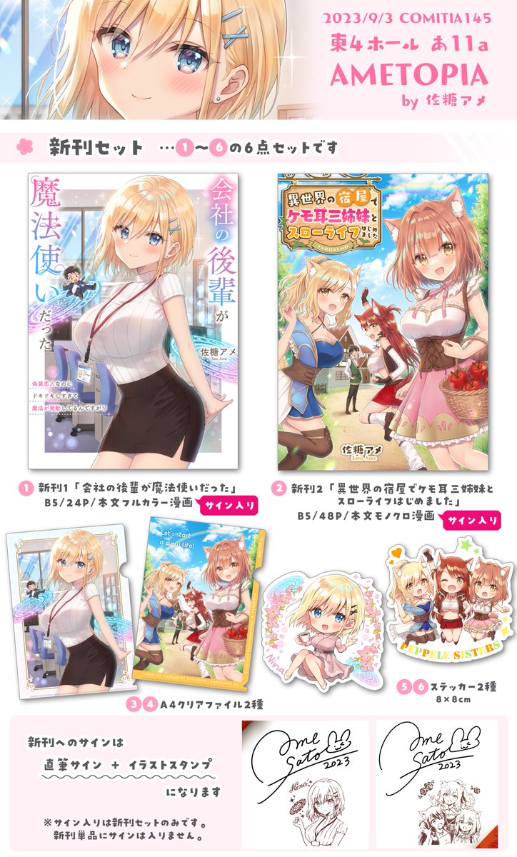 🌻通販のお知らせ🌻 新刊の予約開始しました!新刊セットはクリアファイル&ステッカーが付いて新刊にサインが入ります✨新刊はどちらも描き下ろし有なのでよろしくお願いします! #COMITIA145 🍈新刊セットmelonbooks.co.jp/detail/detail.… 🍈新刊①単品melonbooks.co.jp/detail/detail.…… twitter.com/i/web/status/1…