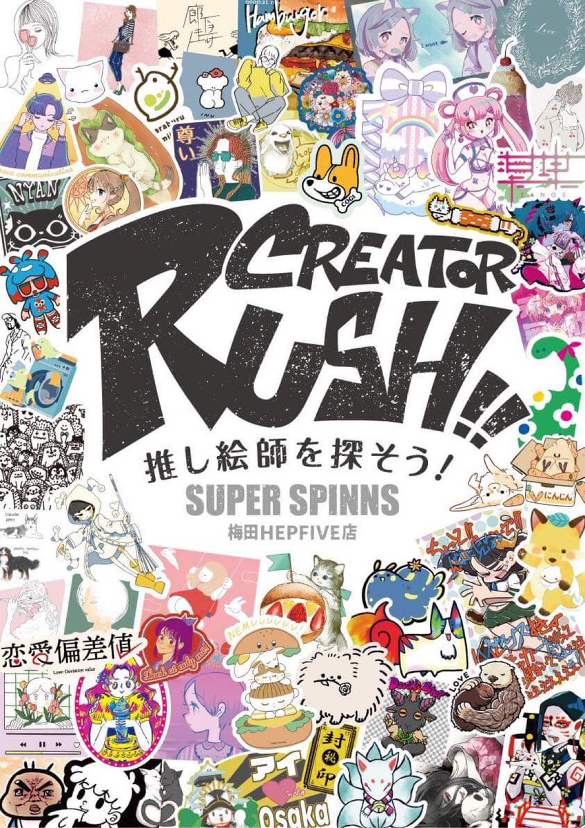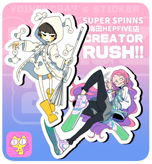 【お知らせ】 SUPER SPINNS 梅田HEPFIVE店でのイベント「CREATOR RUSH!!」に参加させていただきます。2種類のステッカーを販売しますので、よろしくお願いします!✨ ●場所:SUPER SPINNS 梅田HEPFIVE店 ●期間:10/8(金)~10/24(日) #CREATOR_RUSH #SPINNS_CREATOR_RUSH #クリエイターラッシュ