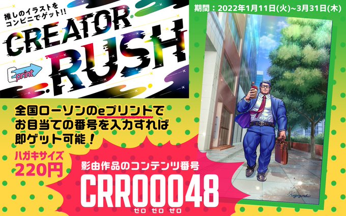 【圧倒的告知】 全国各地のローソンeプリントにて開催される #CREATOR_RUSH に参加します! 影由は過去絵を見直しなんとスタイルが少し良くなりました。220円でゲットできますので是非色んな絵をプリントするついでに影由の絵も! 詳細:e-printservice.net/content_detail… 期間:2022年1月11日(火)~3月31日(木)