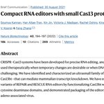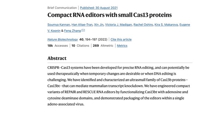 ¡La revolución #CRISPR sigue! El equipo de @zhangf ha descubierto nuevas enzimas Cas13 que pueden: - Cortar ARN mensajero ✅ - Editar ARN mensajero ✅ - Caber dentro de un adenovirus✅ Un paso más cerca de terapias CRISPR🧬 Lee el artículo completo aquí rdcu.be/cIPto