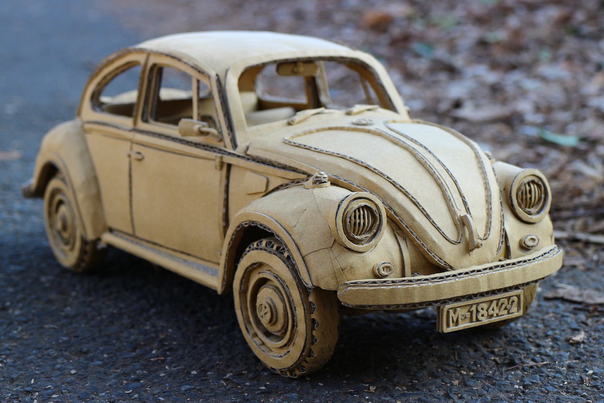 ダンボールのフォルクスワーゲン ビートル。スペアタイヤがつかえて閉まらなかったり、エンジンが大きすぎて閉まらなかったりと結構大変でした! #フォルクスワーゲン #Volkswagen #Beetle #ダンボール #cardboard #ビートル #vw
