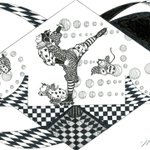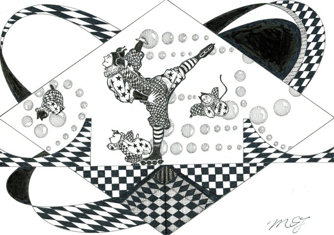 🦶🐾ローラースケートに挑戦してみる道化師たち🐾🦶 by 🎪🃏😸😺🐾《道化師と陽気な仲間たち》 #アトリエの系譜S #道化師と陽気な仲間たち #アナログ #モノクローム #ペン画 #オリジナルキャラクター #mangastyleillustration #picturebookartwork #challenger #ローラースケート