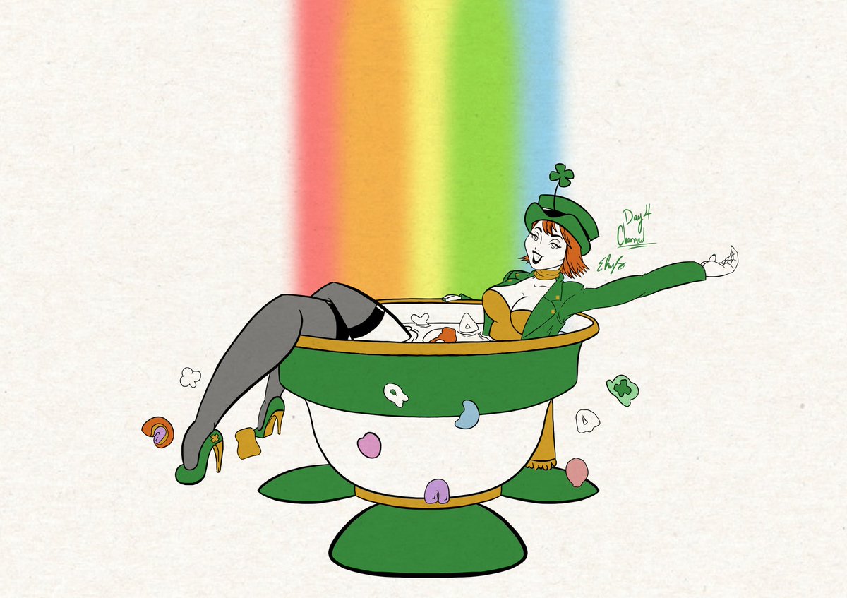 Pinuptober Day Four: Charmed #pinuptober #pinup #pinupgirl #inktober #inktober2021 #dayfour #charmed #2dart #digitalart #photoshop #art #leprechaun #luckycharms #rainbow #cereal #milk #luck #fourleafclover #women