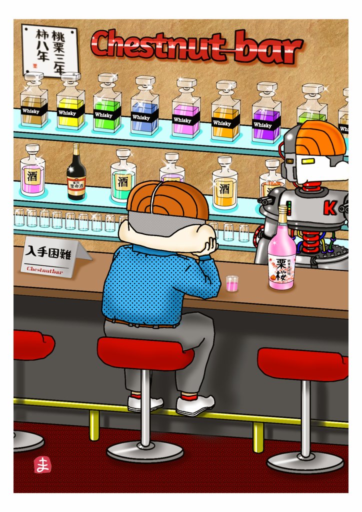 あ、100名の御入店(イイネ)ありがとうございます。 彼は元々戦争の最前線に立つ戦闘ロボ兵を後方支援、メンテナンスを専門とする衛生ロボ兵でしたので聞き役は得意。彼は自我を持ち、自身の存在意義に苦悩、第二の歩みとしてBarを経営することにしました。 #Chestnutbar #マスターK #イラスト twitter.com/matsu_uk/sta…