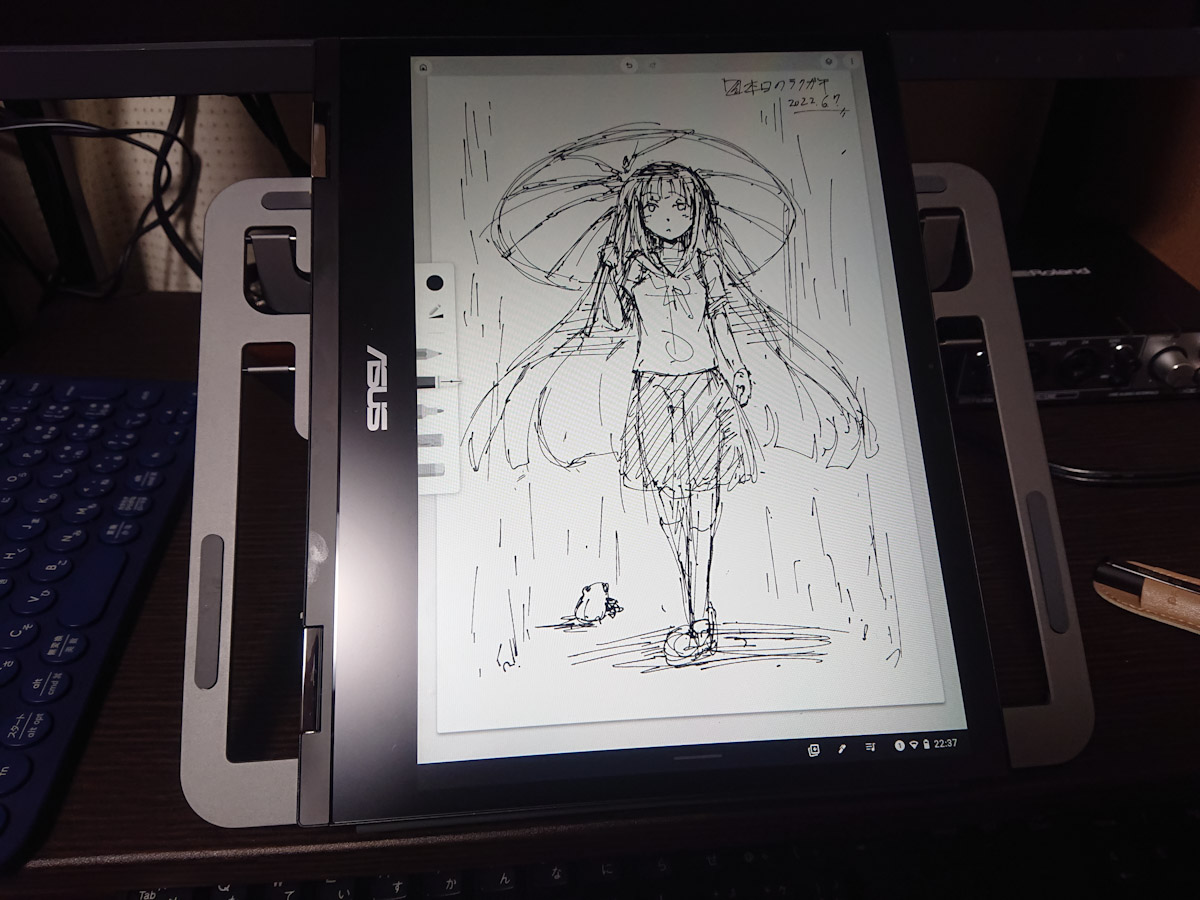 【本日のラクガキ(作業風景)】オリジナルで描いている機械のメイドさん。ちなみにASUS Chromebook Flip CM3とエレコムのペン、お絵描きソフトはアンドロイド版キリタを使っています。 #アンドロイド #絵描きさんと繋がりたい #メイド #作業環境 #ラフ #デジタルイラスト #Chromebook
