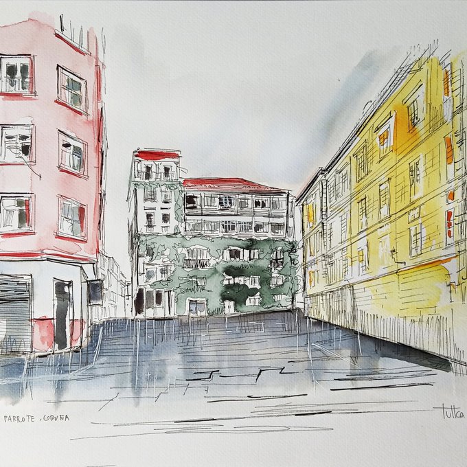 Coruña, Plaza Parrote | Acuarela sobre papel | 2021 #illustration #art #watercolor #architecture #street #cityscape #drawing #perspective #color #landscape #draw #acoruña #ciudad #watercolorpainting