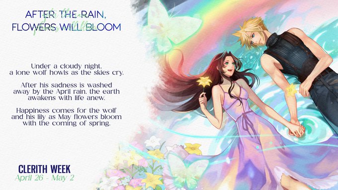🌧️ CLERITH WEEK 💐 04/26 - 05/02 "after the rain, flowers will bloom" This theme reflects the fervent wish of all cleriths that after all the years of despair, a happy ending awaits Cloud and Aerith—together in their Promised Land. #clerith #ClerithWeek #ClerithWeek2022