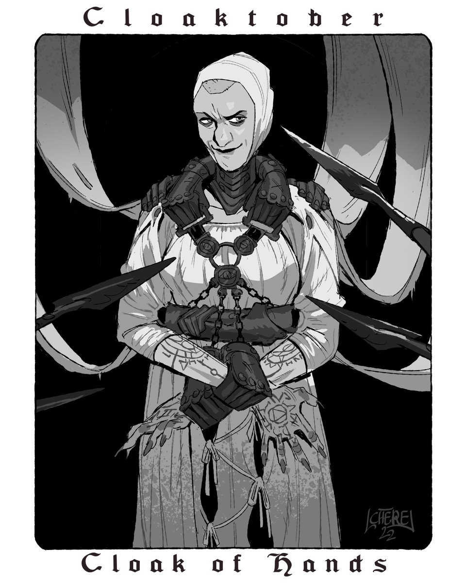 #Cloaktober 17. Cloaks of Hands In the Iron Keep, the punishment for renegade mages is to wear "the grip", a leaden device which blocks magical abilities. But years have worn out this instrument and could shatter at any moment.