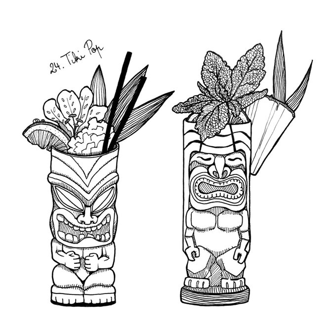24 octobre : Tiki Pop Le terme Tiki Pop renvoie à la mode kitsch inspirée de très loin par la Polynésie dont les Etats-Unis furent friands dans les années 50 ! #tiki #tikipop #cocktail #polynesia #polynesie #inktober #pacifinktober