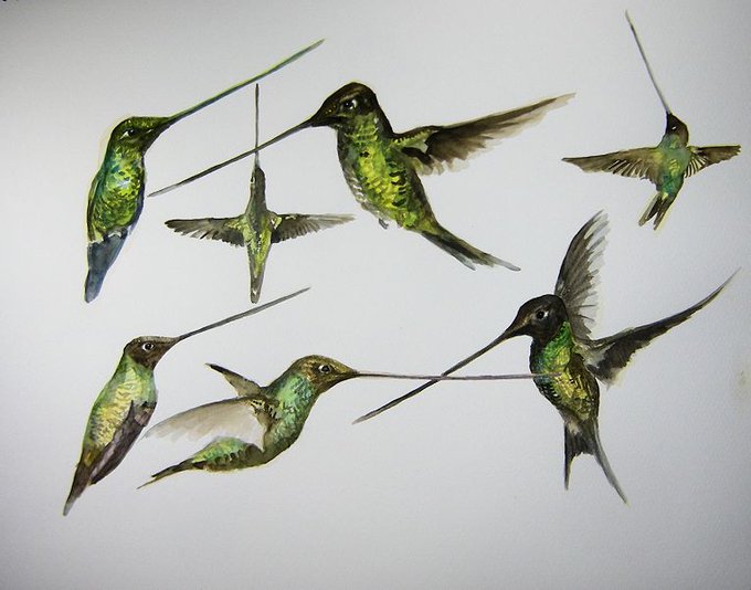 #ヤリハシハチドリ #SwordBilled #Ensifera と #シラコバト #CollaredDove #Streptopelia を #スケッチ #ドローイング 水彩直描き #ハチドリ #HummingBird の一区切り。なんとか数ポーズ足して、昨日の分を取り戻したか?次の頁では、そう言えば描いてなかったなぁ #ハト と、思い、白っぽい種を選択。