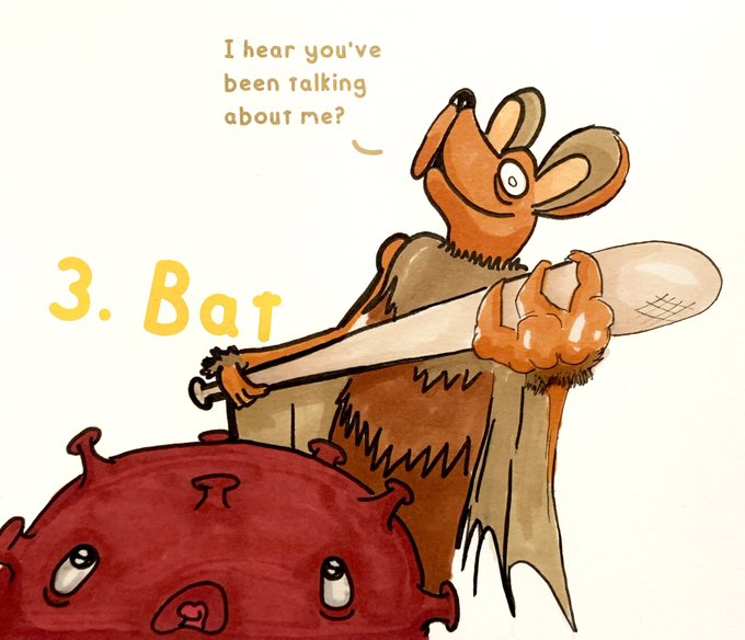 3. #Bat The Rona thought it had escaped the clutches of the Bat. But word spread, and the Bat was back to fix the bad press they’d gotten. #inktober #inktober2022 #inktoberday3 #coronavirus #ink #drawing #doodle #alcoholmarker #coloured