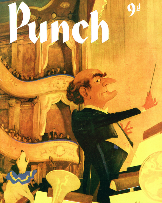 Punch front cover 20 May 1959 Order your prints: punch.co.uk #punchmagazine #punchcartoons #illustration #drawing #art #cartoonart #publishing #britishhumour #1950s #fleetstreet #GeorgeAdamson #concert #conducting #performance #orchestra #MrPunch #dog #entertainment