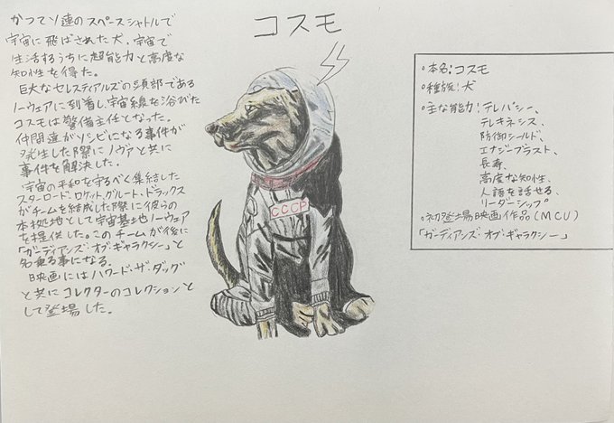 手描きMCUヒーロー列伝コスモ ・本名:コスモ ・種族:犬 ・能力:テレパシー、テレキネシス、高度な知性、人語を話す、統率力 ・初登場映画作品(MCU) 『ガーディアンズ・オブ・ギャラクシー』 #marvel #illust #芸術同盟 #絵描きさんと繋がりたい #みんなで楽しむTwitter展覧会 #cosmo #コスモ