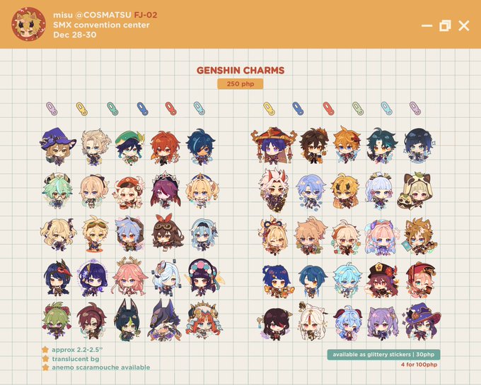 HEWWO HEWWO🐌👋 Here is my Merch Catalog for Cosmatsuri #CosmatsuriFanfair2022 I'll be at table FO-02 for #CosplayMatsuri2022 from Dec 28-30 at SMX Convention Center So excited to release my Nijisanji Heart, Valorant & Genshin charms for the first time ever >< See you there😳