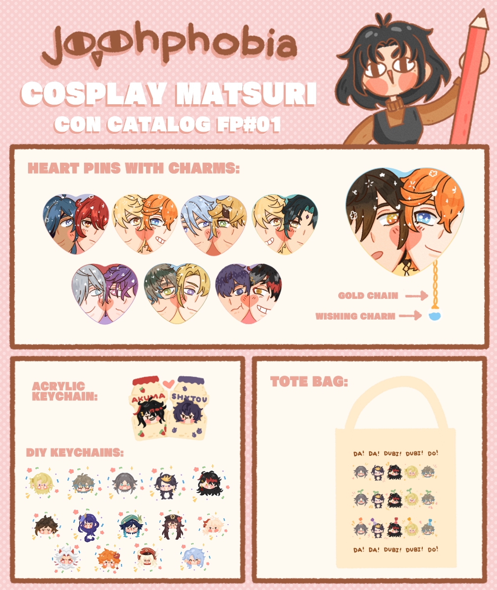 My Catalogue for #CosplayMatsuri2022🎇 1/2 I'll be with [ YUYUKATSUU ] @ FH04! See you soon! Also, Kindly check the thread 🔽🔽🔽 for additional info & updates! #CosMatsuriFanFair2022 I have mostly Genshin Impact & Nijisanji EN merch!!