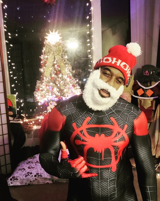 Hope you all have a very #SpideyChristmas 🕷🕷🕷 love Santa Miles . #merrychristmas #cosplay #blackcosplayersrock #poccosplay #cosplayingwhileblack #spidermannowayhome #SantaMiles #milesmorales #staysafe #milesmoralescosplay #intothespiderverse #blackheroes #marvel #santaclaus