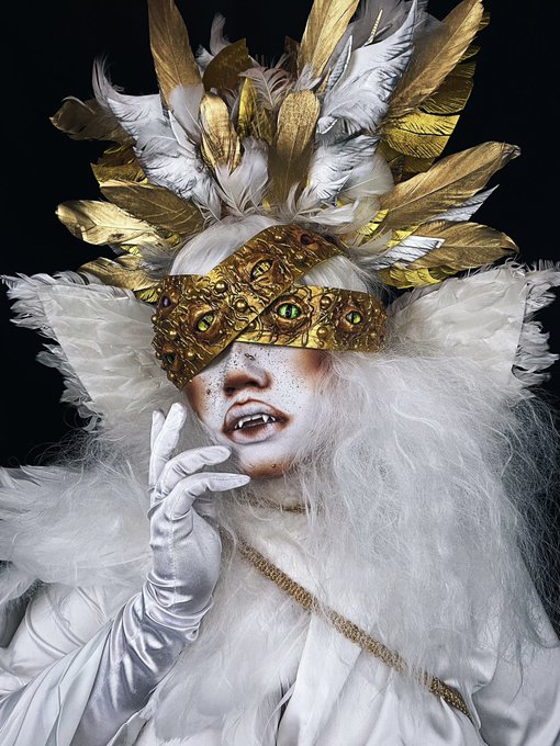 Thrones / Ophanim Angel 👁️☁️⚜️👼🏼 IG/TT: serinabinah @mehronmakeup paradise makeup aq, color set powder in white, metallic gold powder, mixing liquid #angelmakeup #cosplay #creativemakeup