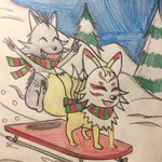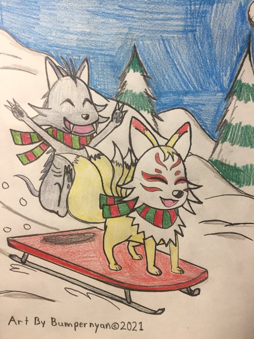 During at the day. We see Pico and kitsune are riding sleigh rides together. 🦊🐶 Only four more days until Christmas my friends! 🎄🌟🎄 #BumperMonster #ArtistOnTwitter #cuteart #illustration #OC #Christmas #Cryptidart #MonsterOC #バンパーブロック #イラスト #クリスマス