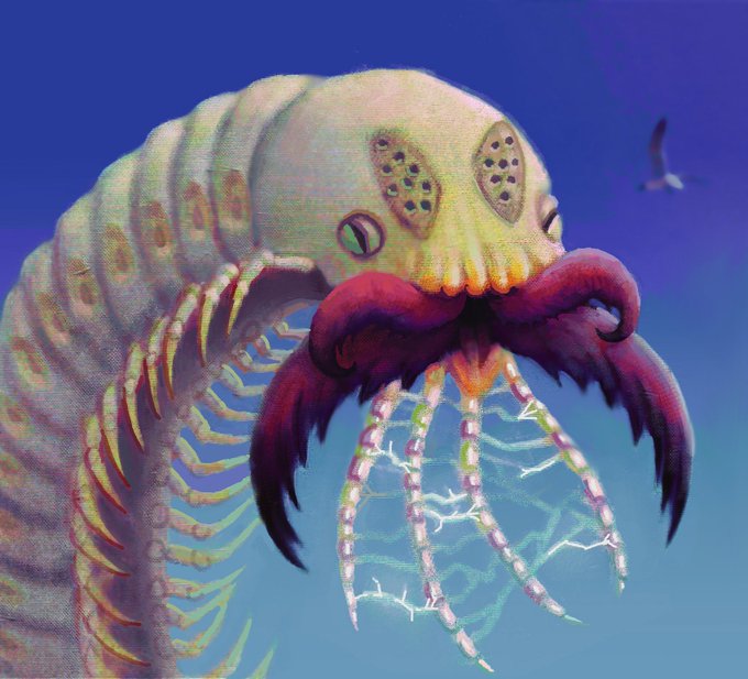 Mongolian Death Worms, a subterranean scourge of the Gobi Desert. Capable of discharging extreme voltage, it stuns prey before feeding. #CryptidinJuly #CryptidinJuly2022 #creaturedesign #digitalpainting