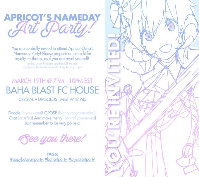 It's the Second Astral Moon; Apricot's nameday month! So how about an art party? The theme is 👑ROYALTY 👑! 🌟Sunday, March 19th | 7PM - 10PM EST 🌟Baha Blast | Diabolos, Crystal | Mist W18 P45 🌟Tags:#appybdayartparty, #bahartparty, #crystalartparty Details under thread! ⬇️